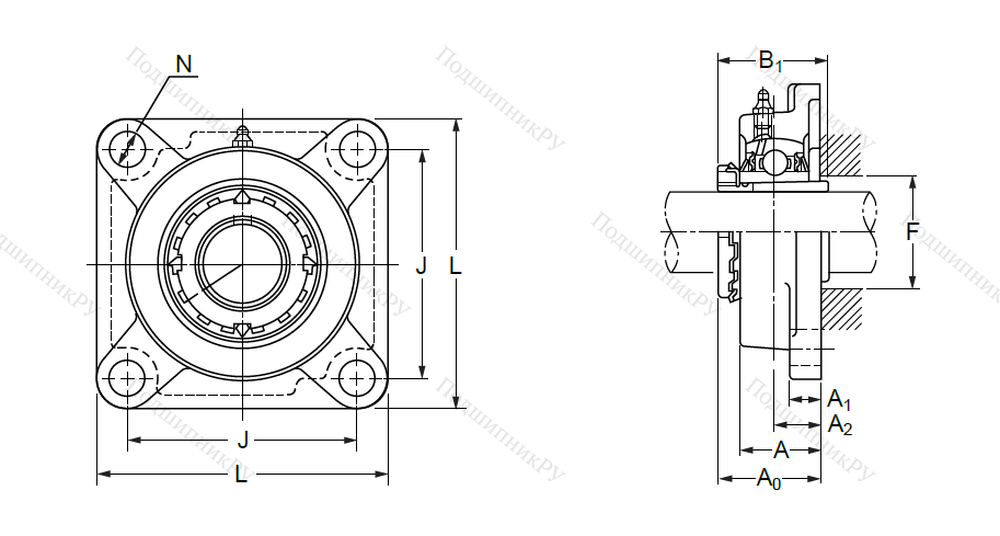 Данная шарикоподшипниковая серия оснащена квадратным чугунным, каучуковым или прессованным стальным фланцем, корпусом F-серии и подшипником UK-типа с закрепительной втулкой разновидности H.